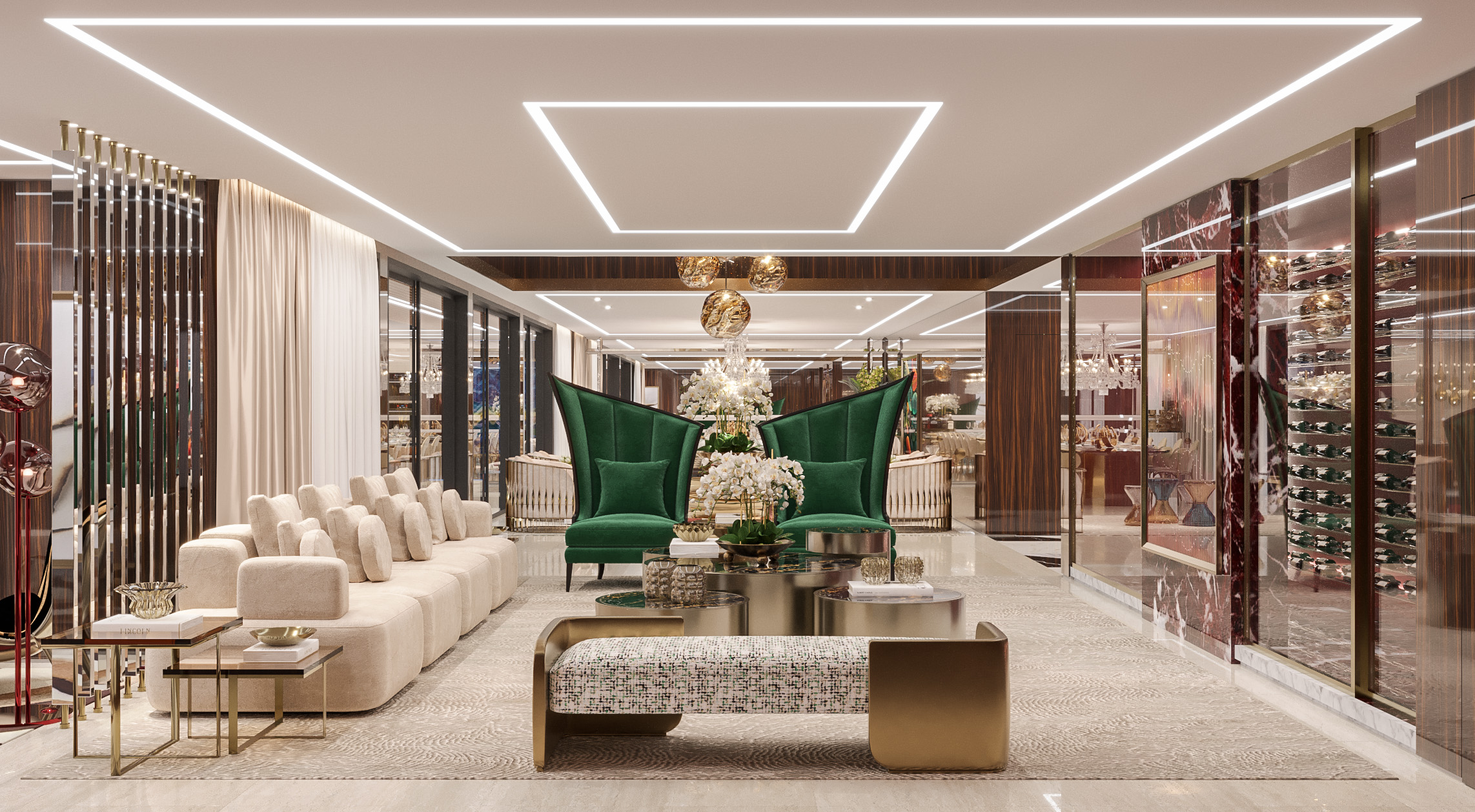 Esse apartamento possui elementos em pedra natural, lâminas de madeira e acabamentos em dourado que se conectam com todos os cômodos projetados, criando uma atmosfera acolhedora e propiciando momentos memoráveis para todos os presentes.
